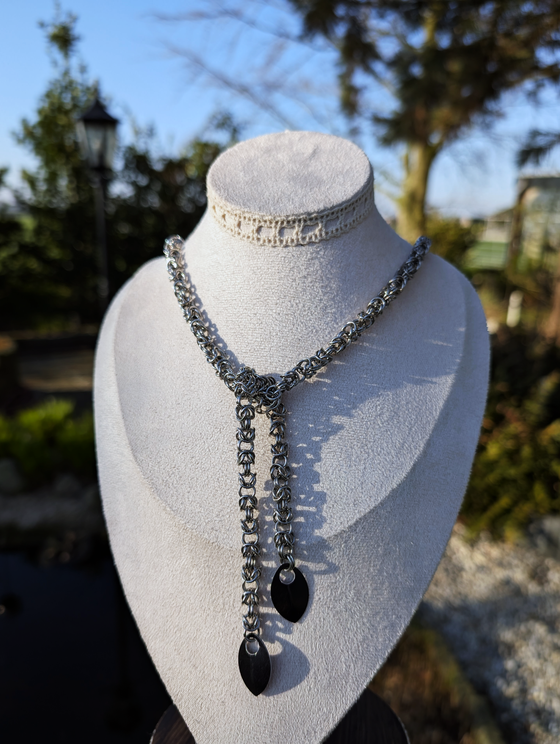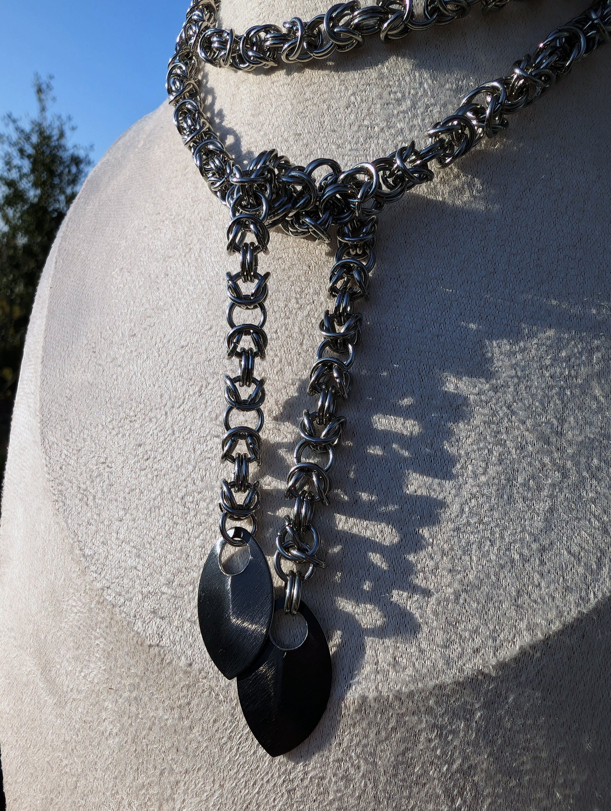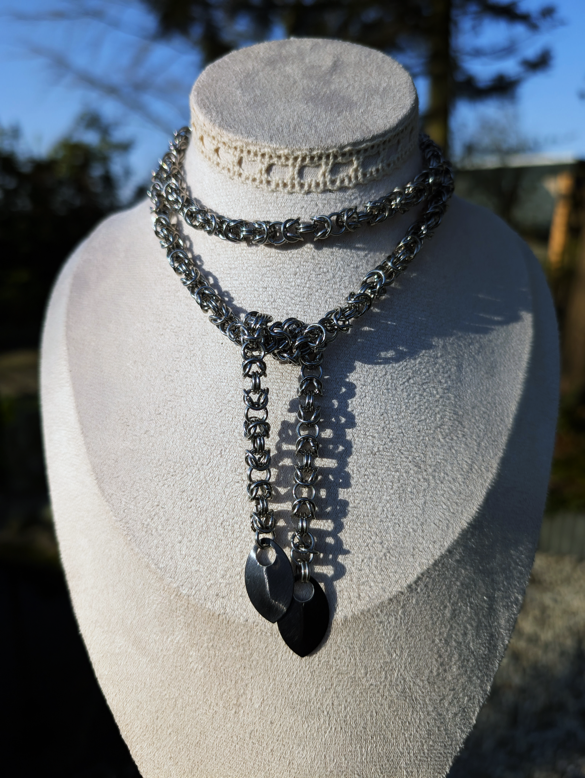 This Byzantine chain slips through your fingers like river metal, cool and deliberate. At each end, a black dragon scale hangs heavy with power, waiting to be drawn into a knot at the front.—no clasp, just intention.