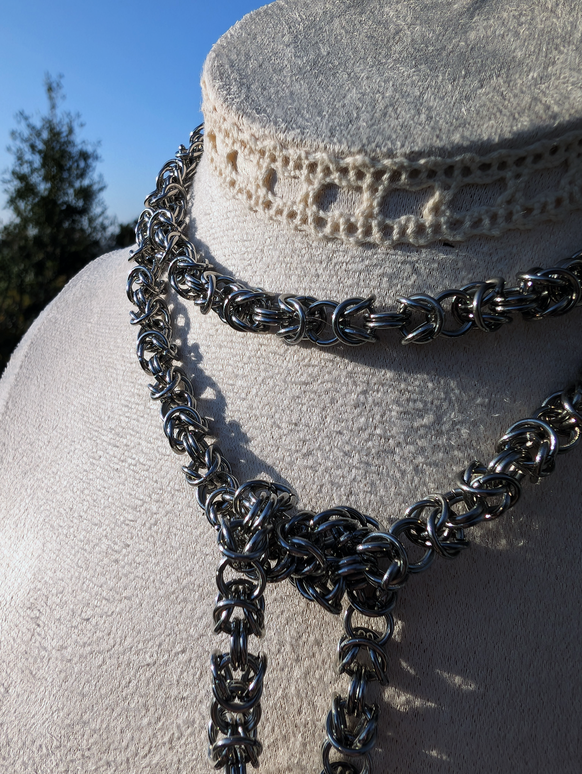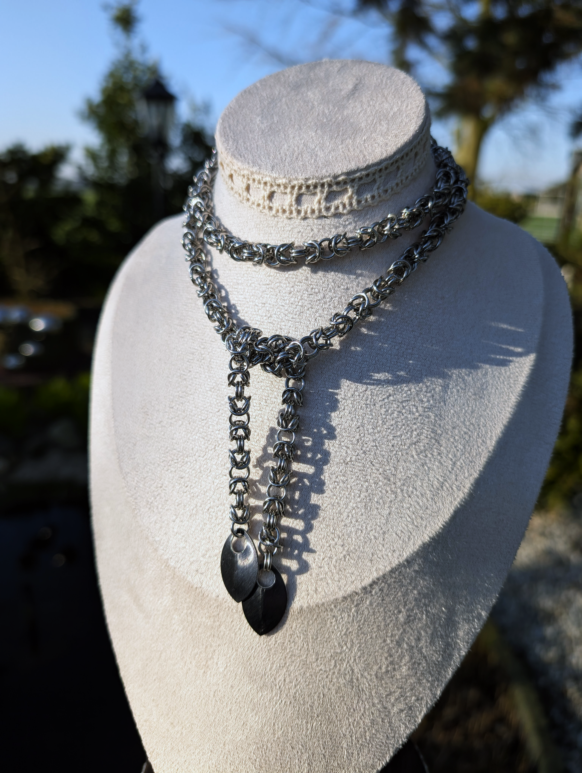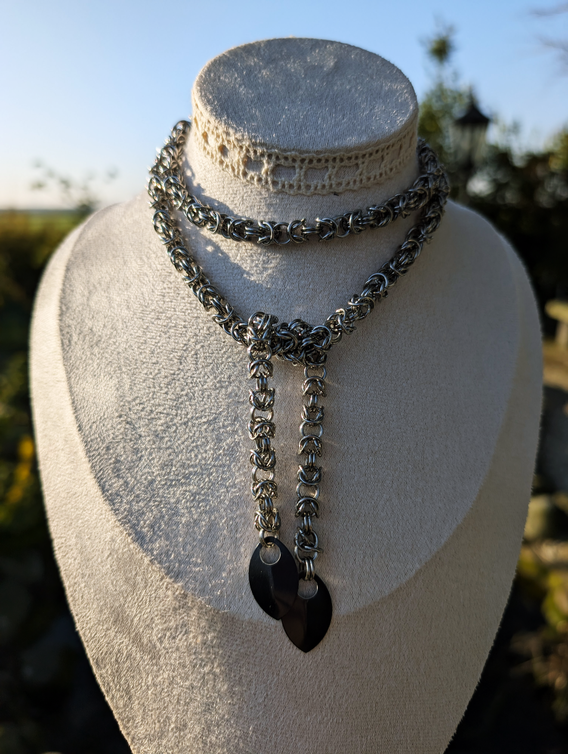 This Byzantine chain slips through your fingers like river metal, cool and deliberate. At each end, a black dragon scale hangs heavy with power, waiting to be drawn into a knot at the front.—no clasp, just intention.
