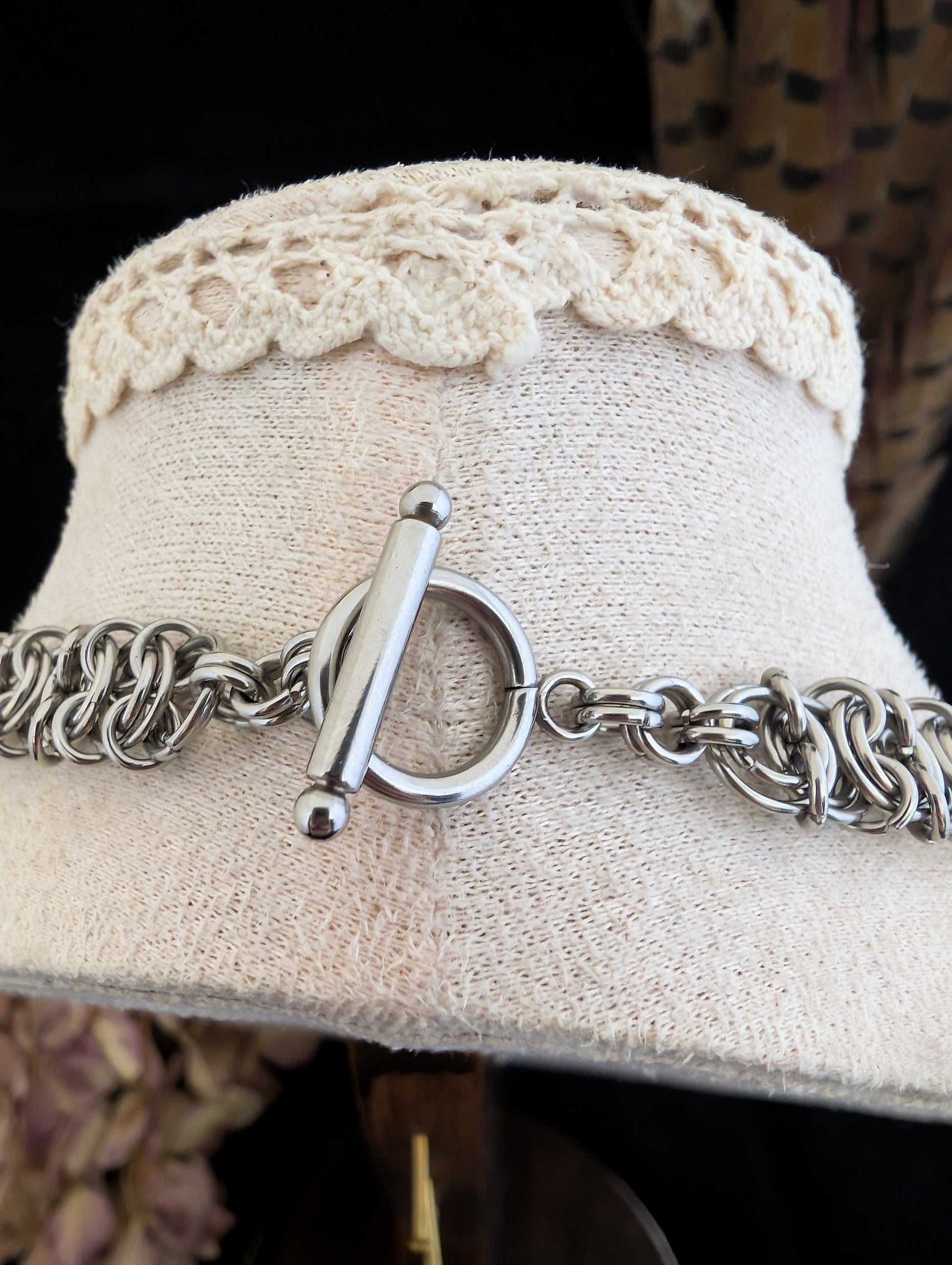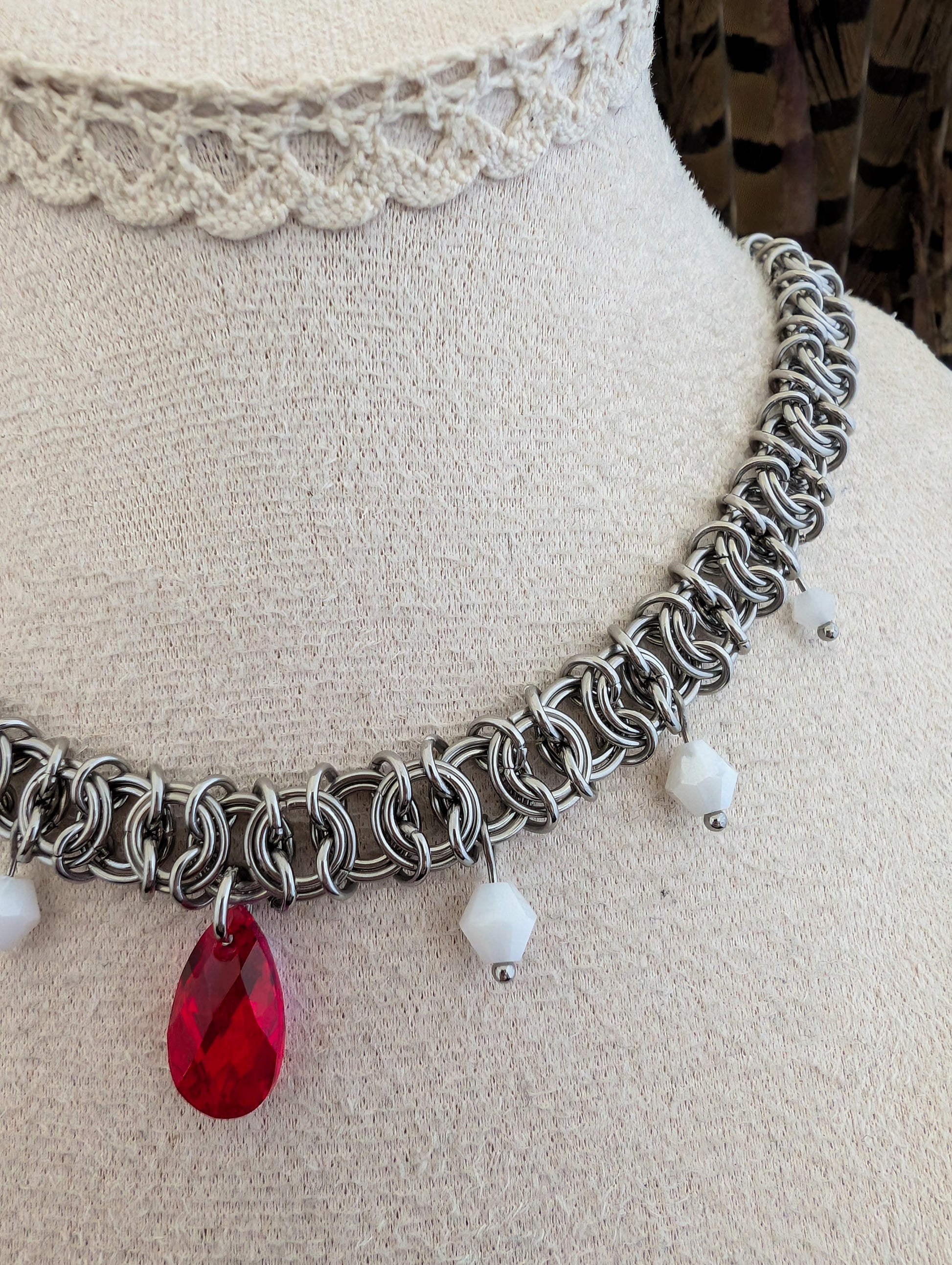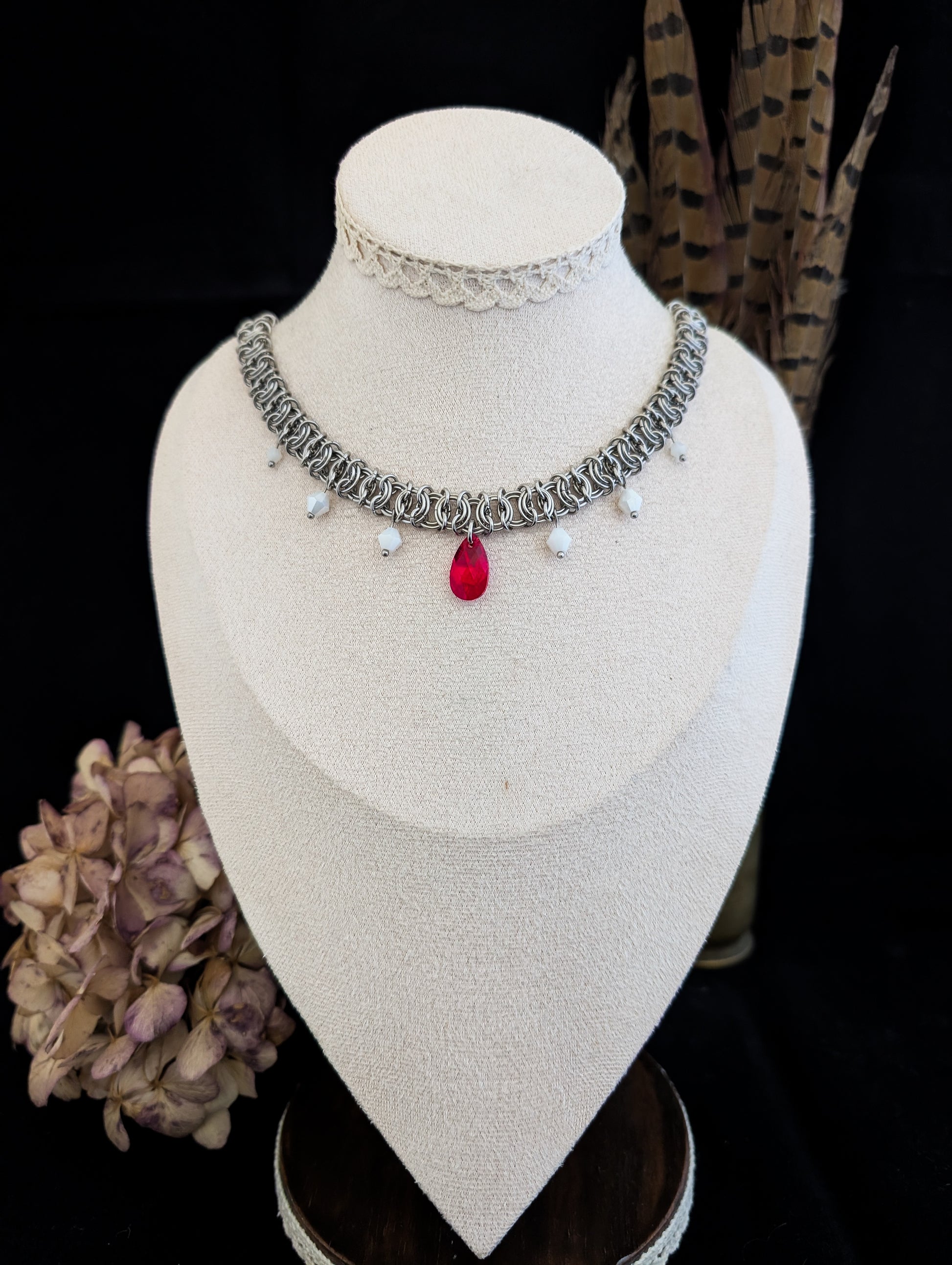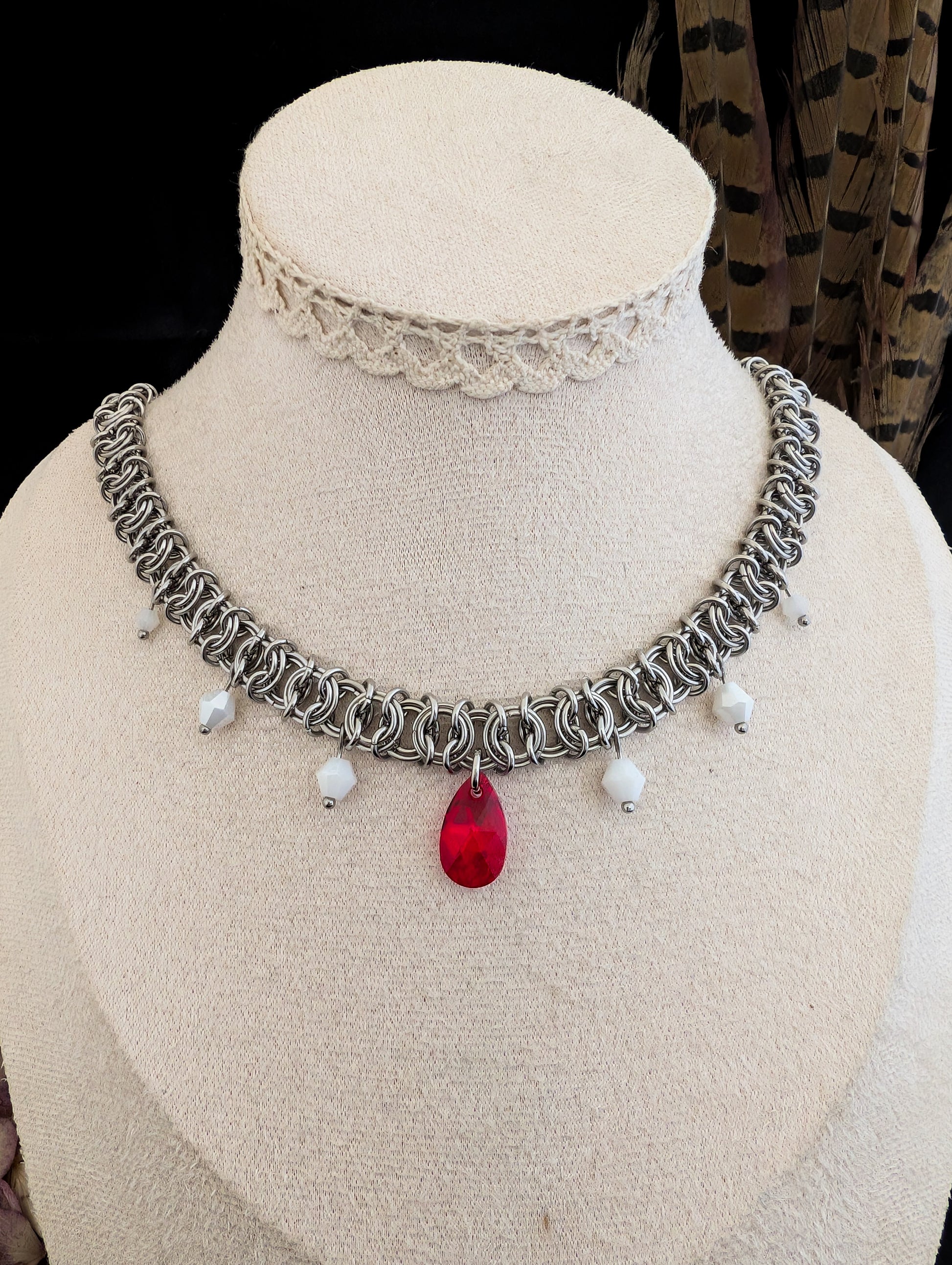 Red draws the eye first. It holds steady at her throat, catching the light without softening for it. The pale facets beside it don’t dull the effect — they sharpen it, framing the centre with something colder, more deliberate.